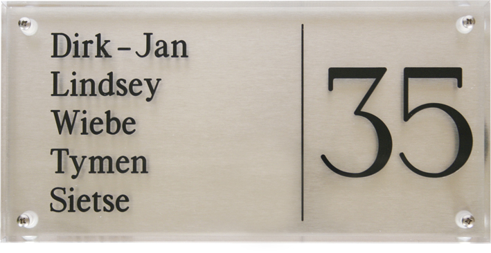 Glaslook is geen glas (glas is uiteraard erg breekbaar), maar een luxe en tegelijk stevige kunststofsoort (8 mm dikte) met de uitstraling van glas. Het materiaal is dan ook volledig doorzichtig en verkrijgbaar in verschillende kleurvarianten. Glaslook is uitstekend geschikt voor gebruik in en rondom uw woning. De tekst wordt in alle glaslook-naamborden gegraveerd, waardoor uw naam niet weg kan slijten of vervagen. Het bijzondere aan glaslook is dat het aan de achterzijde ingegraveerd wordt, dit in tegenstelling tot andere kunststofsoorten. Hierdoor blijft het materiaal aan de voorzijde glad en krijgt het een zeer luxe uitstraling. Tot slot: Glaslook wordt geleverd met afstandbusjes waardoor u het naambord eenvoudig op een korte afstand van de muur kunt monteren.