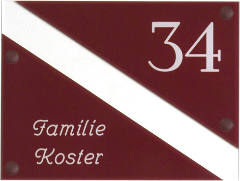 Gravoglas is een luxe en tegelijk stevige kunststofsoort (3 mm dikte), met de uitstraling van gekleurd glas, welke uitstekend geschikt is voor gebruik in en rondom uw woning. De tekst wordt in alle gravoglas-naamborden gegraveerd, waardoor uw naam niet weg kan slijten of vervagen. Het bijzondere aan gravoglas is dat het aan de achterzijde ingegraveerd wordt, dit in tegenstelling tot andere kunststofsoorten. Hierdoor blijft het materiaal aan de voorzijde glad en krijgt het een hele luxe uitstraling. Tot slot: de gravoglas-naamborden zijn standaard voorzien van schroefgaten (tenzij anders vermeld) en worden geleverd met afstandbusjes en afdekdopjes waardoor u het naambord eenvoudig op een korte afstand van de muur kunt monteren.