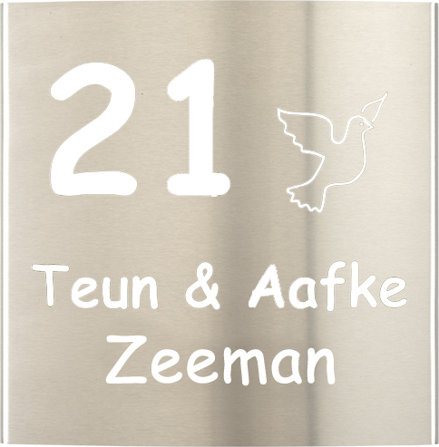 RVS is een zeer sterke staalsoort, welke uitstekend geschikt is voor gebruik in en rondom uw woning. RVS staat voor roest-vast-staal en is daardoor bijzonder weersbestendig, maar niet geheel vrij van onderhoud. Daarom dient uw RVS-naambord af en toe met HG snelglans (te verkrijgen bij de doe-het-zelf vakman en/of bouwmarkt) behandeld te worden. Het is niet verstandig de RVS-naamborden te poetsen, doordat de tekst op alle RVS-naamborden beletterd wordt; zo kan de tekstlaag niet beschadigen of vervagen, indien u geen belettering wenst, dient dit aan te geven in de opmerkingen, wij voorzien dan het naambord van een lasergravure, deze is altijd antraciet/zwart. Tot slot: alle RVS-naamborden worden standaard geleverd met RVS-bevestigingsmateriaal om zo oxidatie bij de schroefgaten tegen te gaan. (N.B. Bovenstaande geldt ook voor alle aluminium en RVS-look naamborden 1400/1500 serie met de uitzondering dat deze naamborden standaard zonder schroefgaten, maar zelfklevend geleverd worden). RVS uniek materiaal, geschikt voor allerlei stijlen, dat tegen een stootje kan!